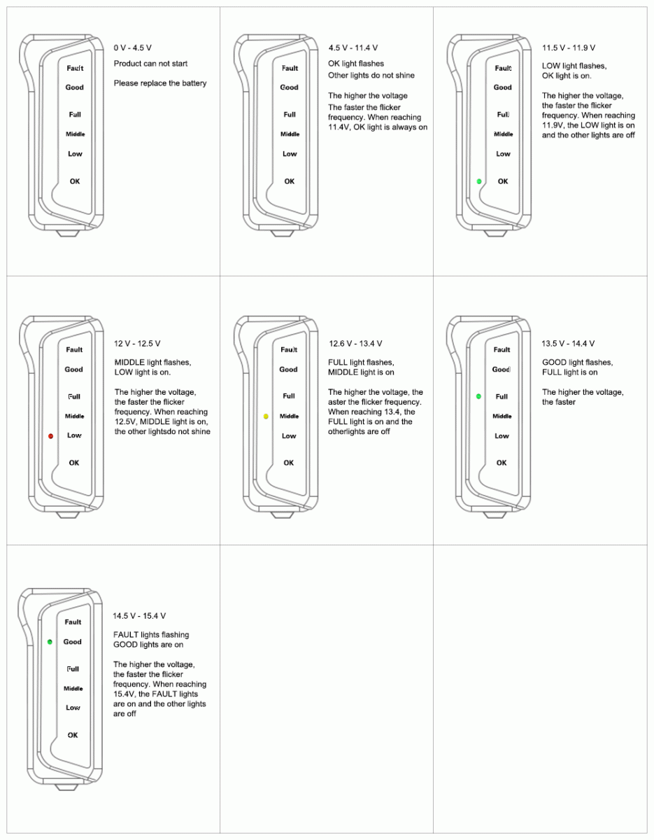 On connecting, the respective lights will be lit or will be flashing, indicating the battery status and alternator status. Read out chart is provided to understand the results and diagnosis of the battery unit.