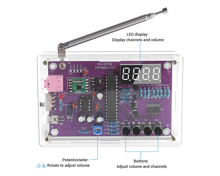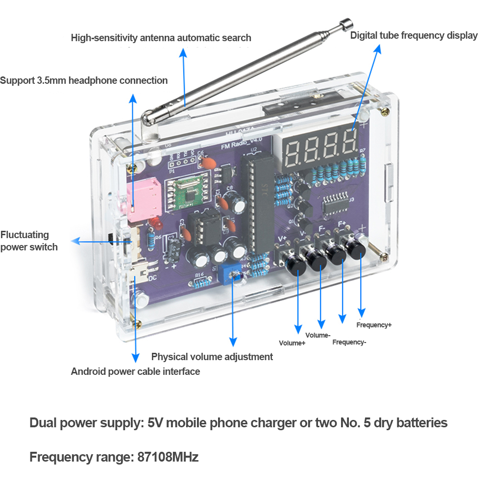 The power amplifier in this kit uses the TDA2822 integrated circuit, delivering a simple circuit design, excellent sound quality, and a wide voltage range. The sleek acrylic case not only adds to the aesthetics but also provides portability and protection for your completed project. Plus, with a USB power input (compatible with mobile phone chargers) and a headphone jack, this FM radio is both practical and versatile.