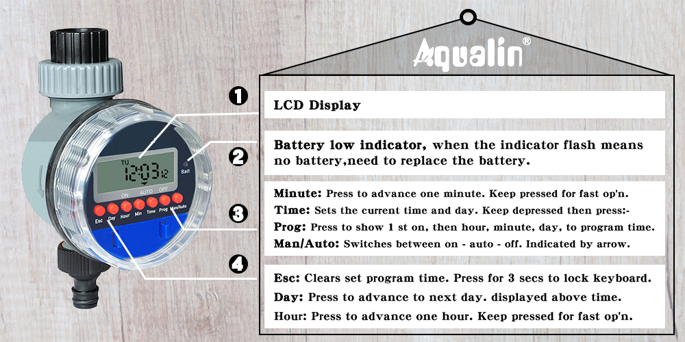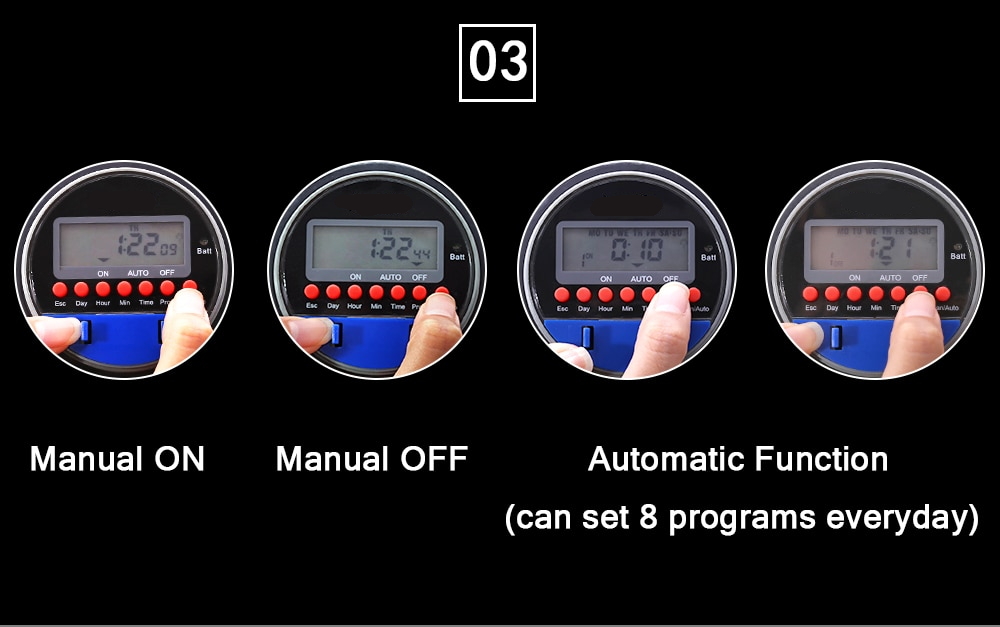 A: There is an ON/OFF button to turn on and off the tap any time you would like to do so manually. For automatic operation, set the time of day you want it to operate and then adjust the length of time you want it to remain open. This can be programmed for each day of the week. You can also turn it on and off for 16 different times and for various time lengths.