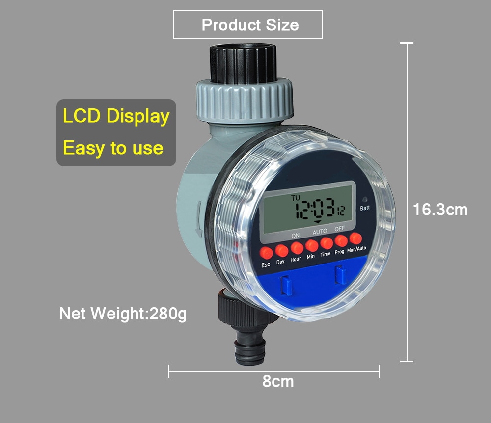 Impact and weather-resistant ABS material with plastic cover keeps out dust, soil and dirt away from the LCD display. The LCD interface displays easy-to-read text that alternately shows current date, time and program status. It has an easy ON and OFF button switch and watering program settings (1-16 options) that are fool-proof, straightforward and user-intuitive.