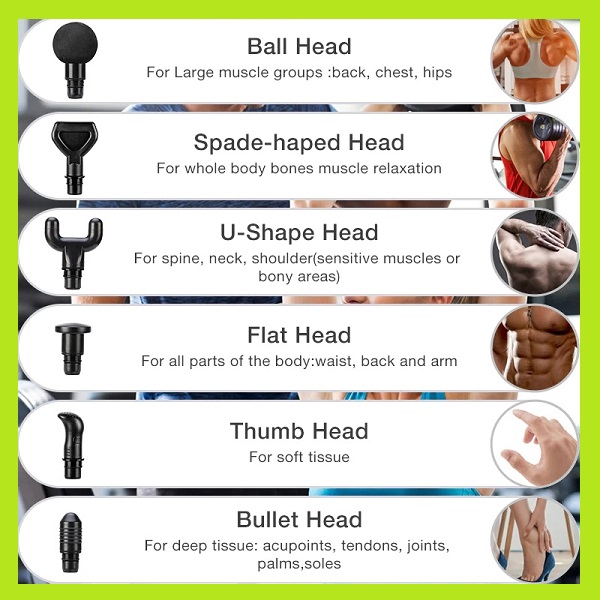 Each shape of the head provides optimum massaging to various muscles in the body, as detailed below.