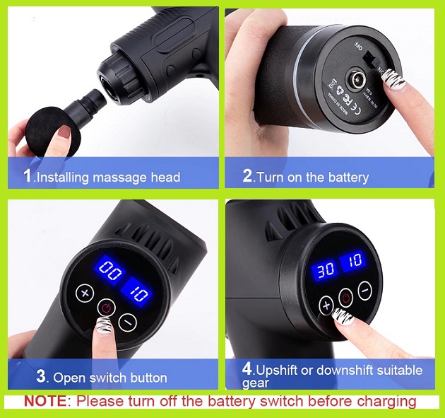 The massage gun can be used in the target muscle for 15 to 20 seconds in between the work out to relieve any muscle spasms that you may experience when increasing the intensity level of the work out. It can also re-energize and fight fatigue, allowing you to increase the number of repeats possible.