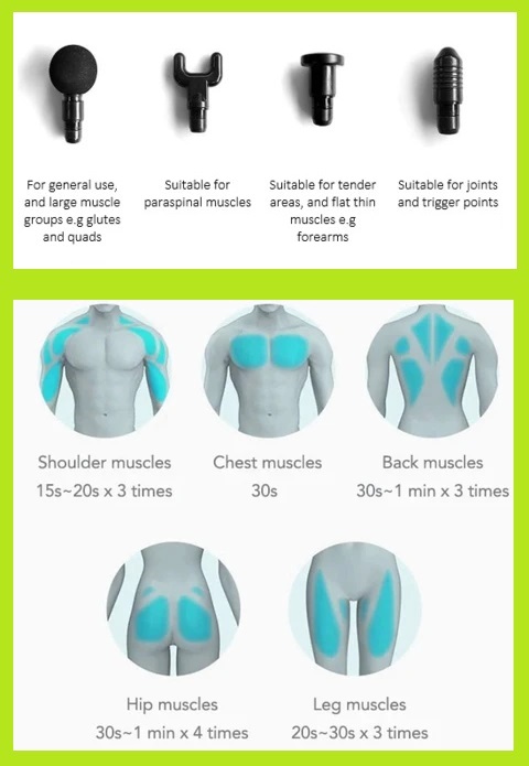 Using the Massage Gun for 30 seconds at the target muscle will “wake-up” the muscle and instantly activate it. Recommended to use before you use muscle specific gym equipment.
