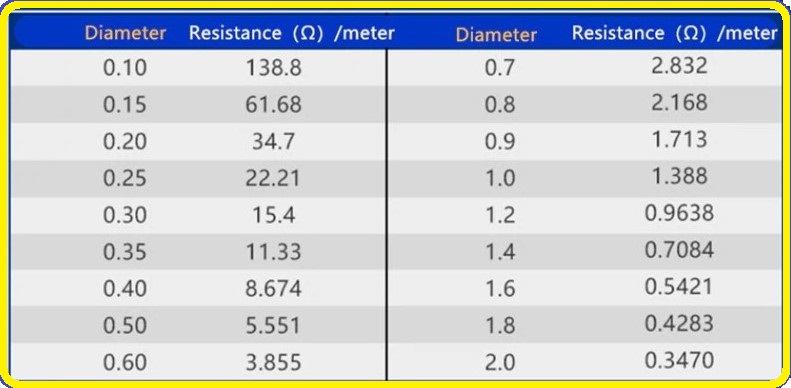 Resistance data (per meter) is provided below.