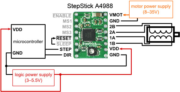 | STEP | I/O | Arduino generates pulses to STEP, each pulse gives one step turn |