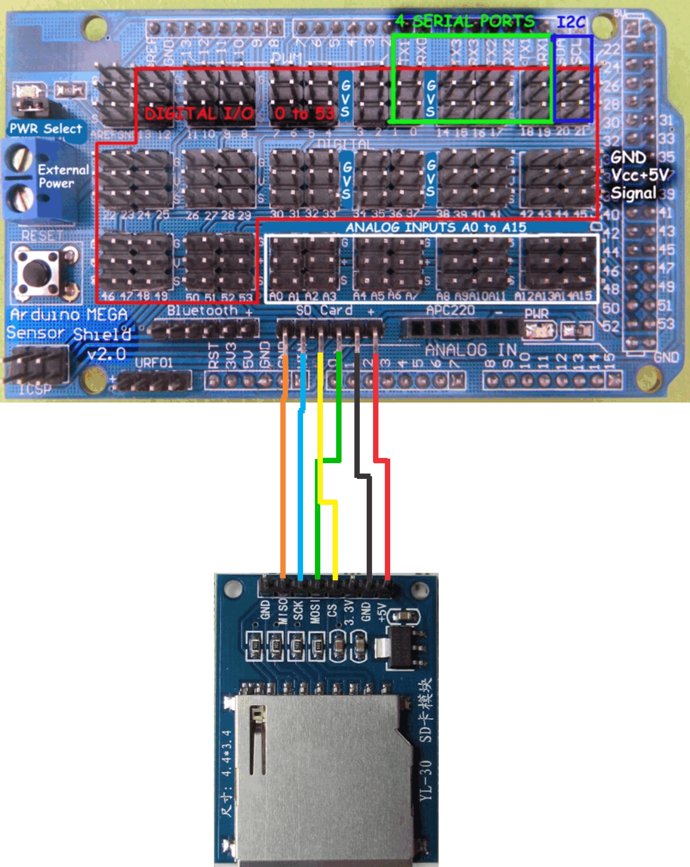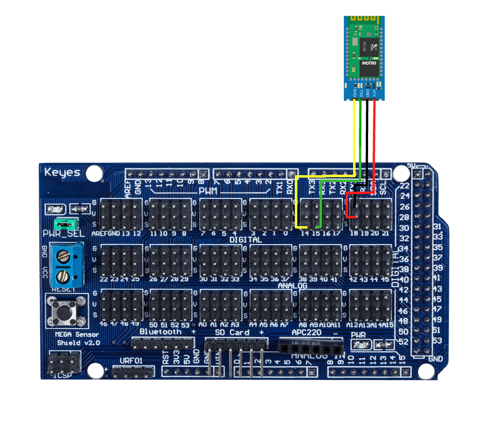 This is a short tutorial* to show you how to interface the Bluetooth module with the Arduino Mega Sensor Shield. Here we are going to use Serial Channel 2 of the Arduino Mega to commuicate with the Bluetooth. First of all, wire up the circuit as shown below.